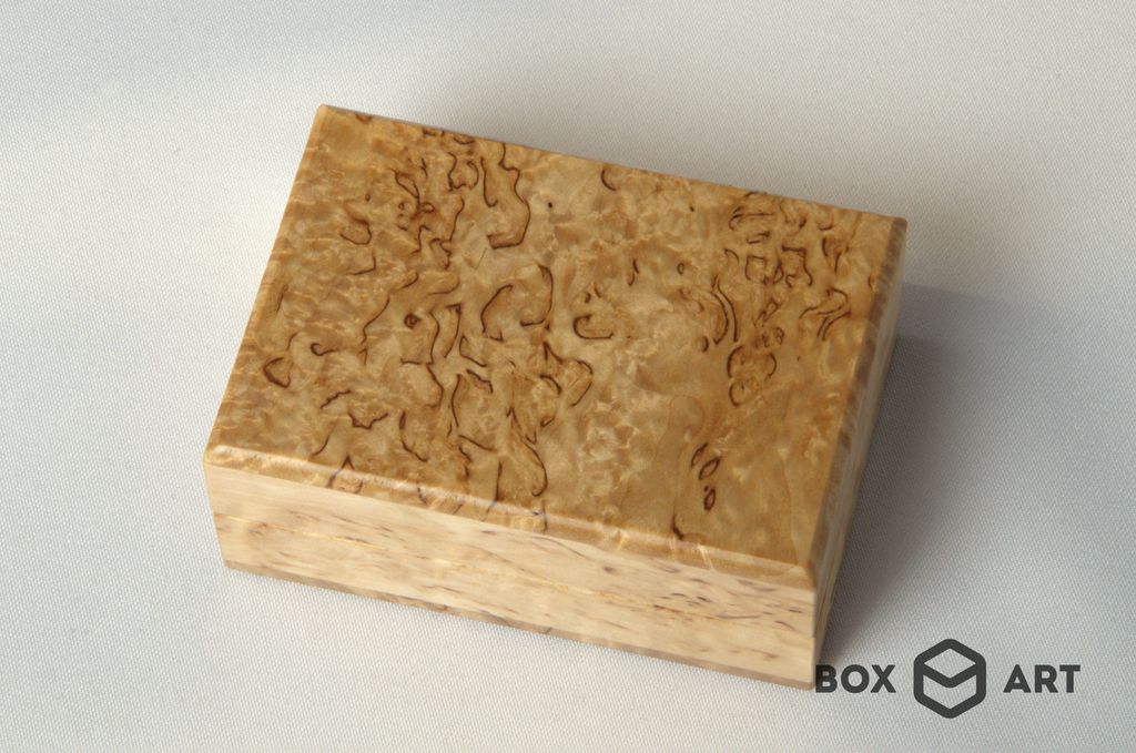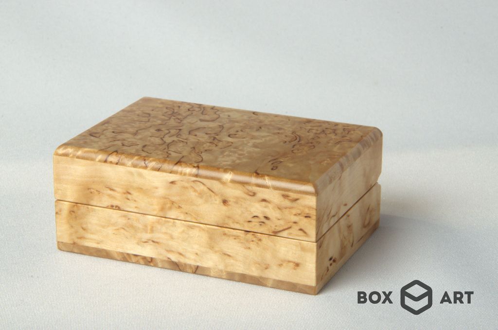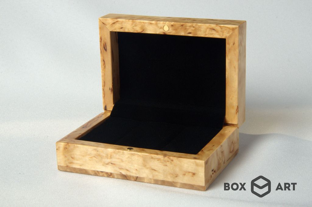 Изготовлена из массива карельской берёзы, бесцветная лакировка, подушечки с искуственным бархатом, магнитный замок.