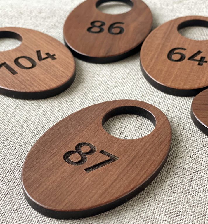 Деревянные номерки, из массива дерева изготавливаются на заказ по вашему или нашему макету.