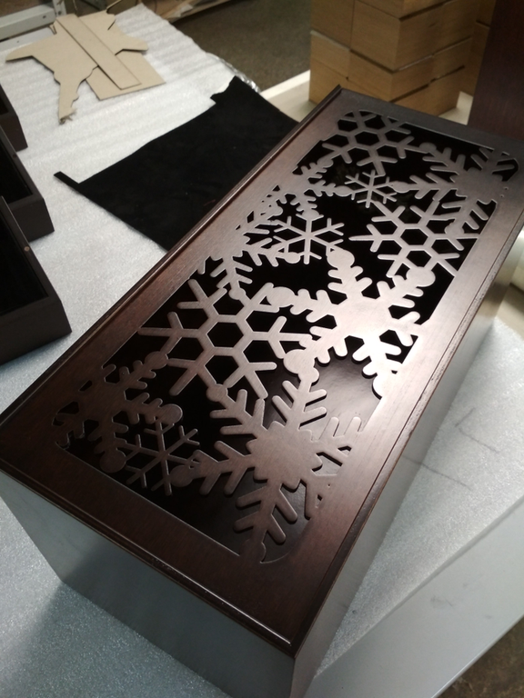 Пенал из березовой фанеры со сквозным узором на крышке, морилка, лак. Размер (35x15x15 см) изменяем под габариты изделия.
