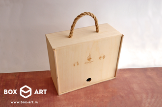Пенал из березовой фанеры с веревочными ручками и гравировкой на крышке.