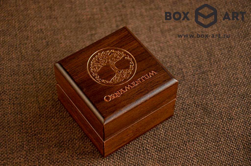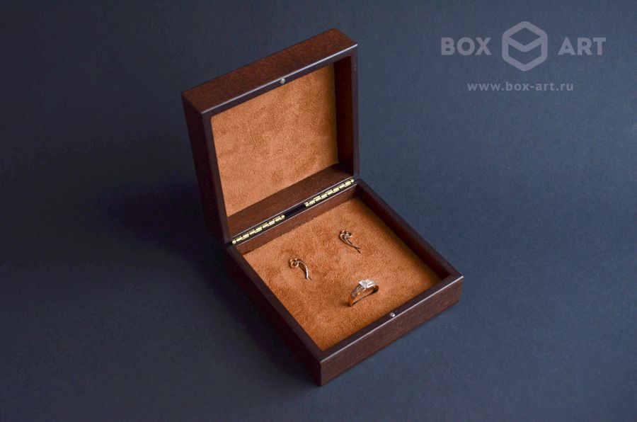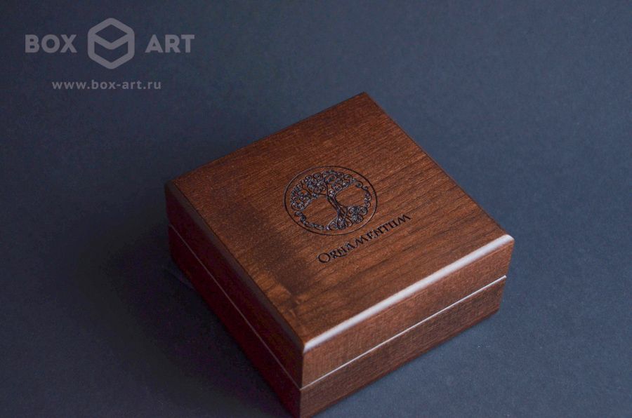Футляр для ювелирных украшений (серьги и кольцо). Выполнен из дерева со шпоном американского ореха (гравировка логотипа на крышке и второй вариант - тиснение золотой фольгой), внутренняя отделка - искусственная замша.