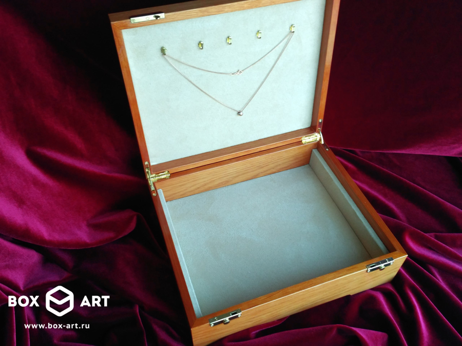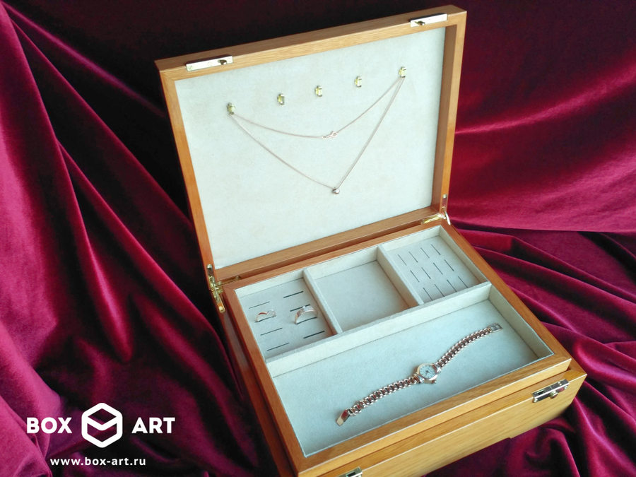 Футляр для ювелирных украшений со съемным ящиком. Выполнен из массива дуба, внутренняя отделка - замша.