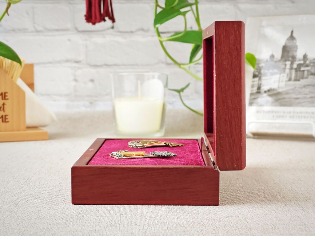 Внутренняя отделка шкатулки соответствует пожеланиям заказчика: ложемент изготавливается с учётом цвета, формы изделия.